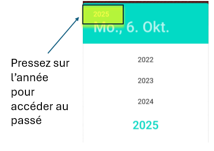 Oui, sur certains appareils liés à Android, la sélection des années se situe parfois sur une zone réduite de l'écran. Pour activer les années, pressez précisément sur l'année (cf. image):